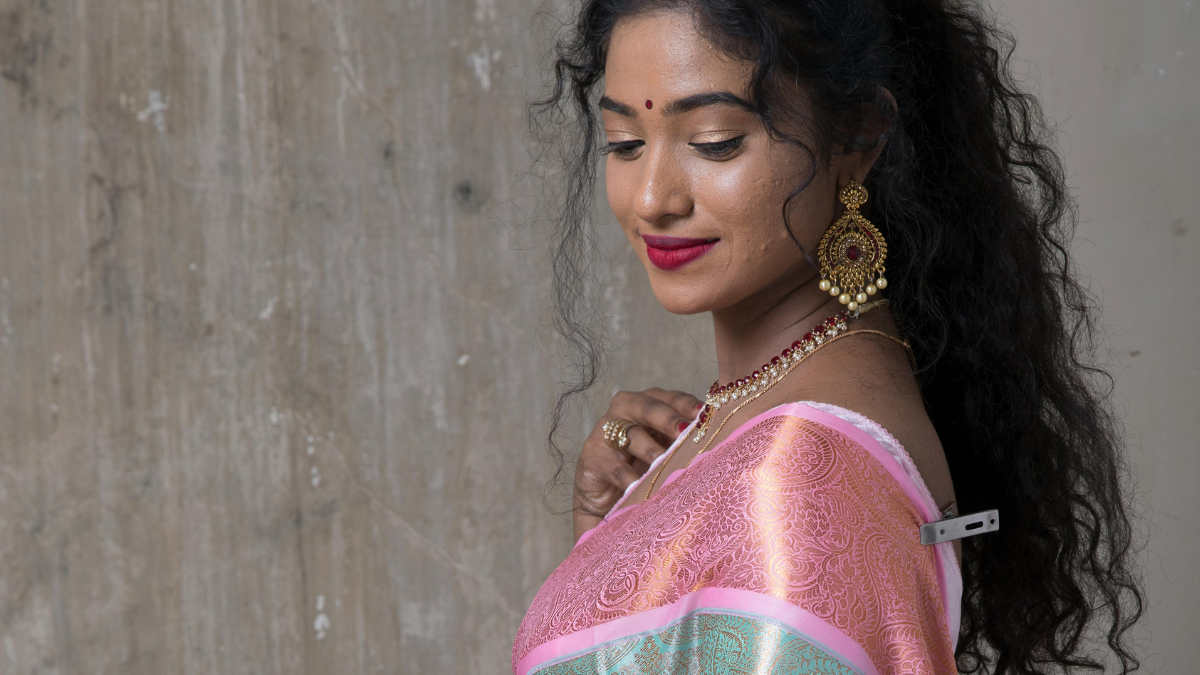 Drape effortlessly in an elegant, embellished pink-and-gold saree. Tikhi Imli brings you a pure organza saree that holds your body shape. The embellished brocade blouse makes it glamorous for occasions like weddings or parties. This saree is a classic pink with golden accents. It comes in a standard length of 5.5m with a 0.8m blouse piece, allowing you to customise the neck design as you like. With this, you can opt for a V-shaped neck and a dori at the back. On Myntra, it is available at 75 per cent off. Go with a sleek low bun, fresh flowers, and floral accessories. And the gold shimmer eyeshadow will enhance the sparkle of the beads and stones. Accessorise it with long shimmery earrings; go for silver-plated ones. Plus, don't forget metallic golden heels.