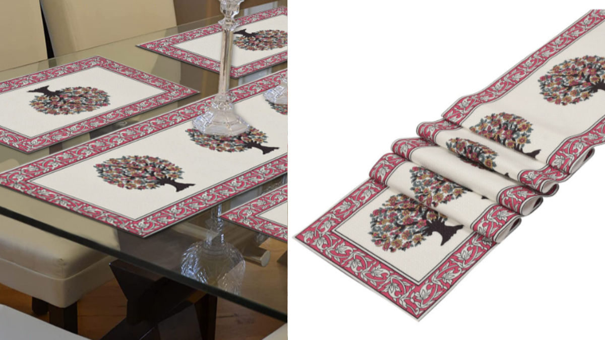 Handicrafts in Indian households can never go out of trend and comfort. This pink and green floral block-printed table runner by Handicraft Palace is a perfect match for elevating the style of your house. Available in various patterns and colours at Rs. 449 at Myntra. This beautiful table runner with a gorgeous print of green leaves and pink flowers is a perfect blend of freshness and aesthetic vibes for your living area or dining table.